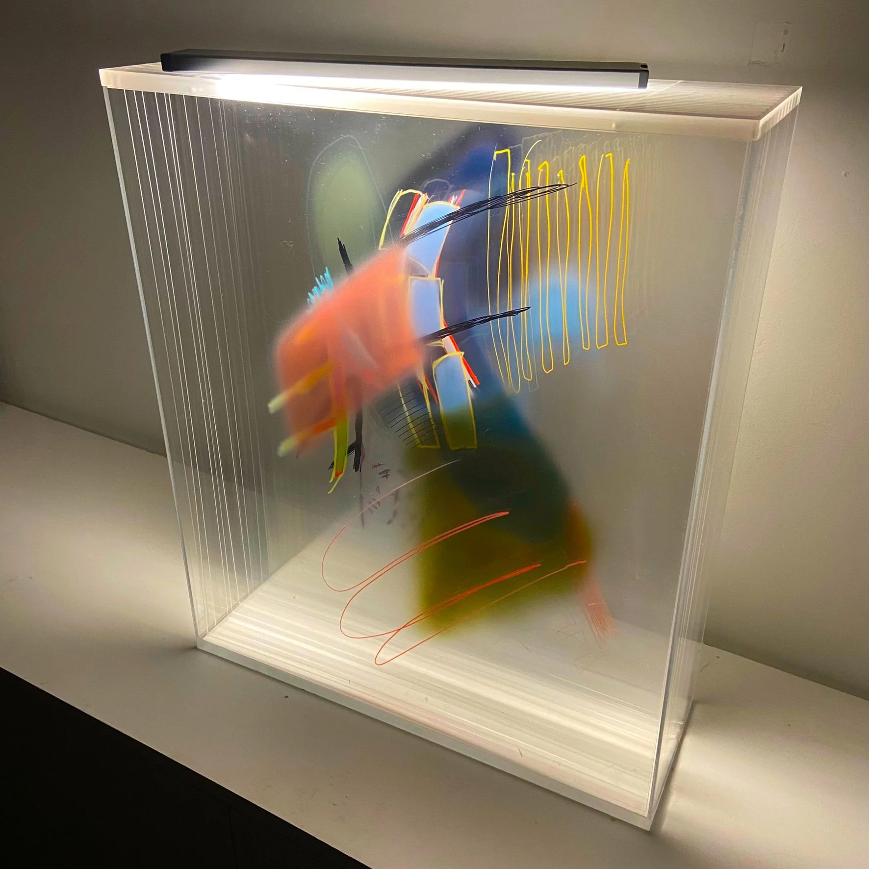 The 3D works are expressionistic and nonobjective; entirely devoid of narrative content. The surfaces of these paintings span a range of materials – paper constructions, canvas-upholstered Styrofoam constructions, plexiglass constructions, and Box Paintings (prints on successive layers of plexiglass, boxed up for archival purposes).